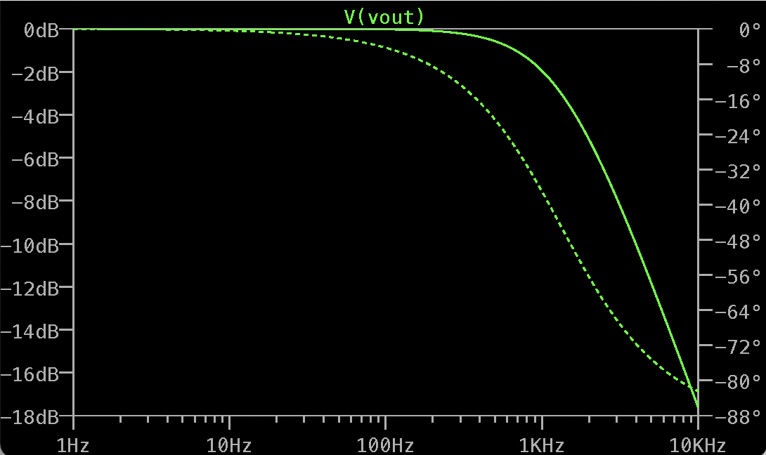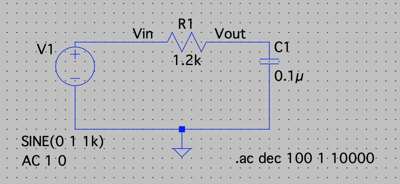 The behavior of filters are simulated using LTSpice. We first draw a low pass RC circuit with R=1.2Ω and C=0.1μF using LTSpice, as shown in Fig.1. Then, we simulate the frequency response of the cirucit from 1Hz to 10kHz by using an AC voltage source. On fig.2, we can observe that the circuit passes low frequency signals, and as frquency gets higher, Vout decreases.