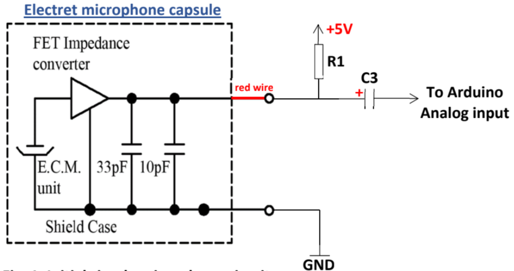 We moved on to the audio aspects of the robot. A microphone circuit is built to collect sounds that will be processed by Arduino. We started with building the microphone circuit without amplification shown in Fig. 6, using R1=4.02kΩ and C3=0.22μF.C3 froms a highpass filter with R1, which can attenuate low frequency signals that are not useful.