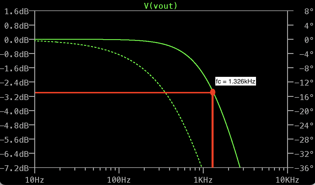 The cutoff frequency is approximated by marking the point that is at -3dB, as shown in fig.3. By doing that, we get a cutoff frequency of about 1.325 Hz. Compared with the cutoff frequency calculated using formula 1/(2πRC), we confirmed the approximation gived us correct result - both are around 1.3 Hz.