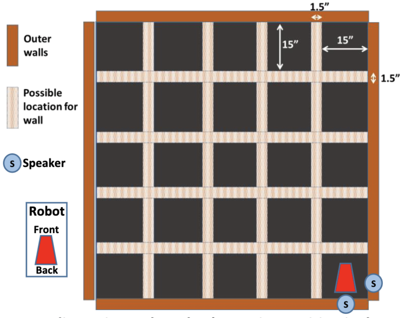 In the final lab, we worked on implementing RF communication, DFS navigation, PID control, and combining all codes we did so far. Our goal is to program the robot so it navigates the maze and completes various during the final demo. Fig.1 shows the overall dimensions of the maze. In the beginning of the demo, the robot will be positioned to the lower-right corner of the maze. It will remain at the starting position of the maze until it detects a 440 Hz frequency. In case the robot fails to identify the frequency, an override button should be implemented to indicates the beginning of navigation. The robot will search the maze using DFS algorithm and continously look for treausures, which are IR LEDs at different frequencies. Every time when a treasure is found, robot will measure the treasure’s frequency and send the frequency to base station, where the frequency value will be desplayed. After total of two treasures are found, robot will imediately stop navigation and then blink its onboard LED.